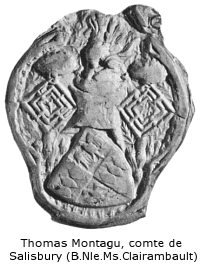 ledit conte s'en ala vers Jargeau.En ce temps le duc de Bourgongne retourna en Hollande, accompagné de aucuns de ses plus féables hommes, pour de rechief convenir avec la duchesse Jaqueline, sa cousine, et prendre les seremens de fidélité d'aucuns nobles du pays et bonnes villes, qui point encore ne l'avoient fait. Après lesquelx receuz, grand espace de temps, vinrent ledit duc et la duchesse Jaqueline ou pays de Haynau, où ilz alèrent par les bonnes villes recepvoir les seremens pareillement comme ilz avoient fait en Hollande et en Zélande, tant des nobles, du clergié, comme des bourgois et communaultés. Desquelx en plusieurs lieux ilz furent révéramment et honorablement receuz, jà soit ce que aucuns des dessus diz pays feussent de ce petitement contens. Toutesfois ilz ne veoient mie, que ad ce poussent bonnement remédier. ![]() Au mois de mai, le comte de Salisbury, homme expert et très renommé en armes, convoqua, par l'ordre du roi Henri et de son grand conseil, jusqu'à six mille combattants ou environ, gens d'élite et éprouvés en armes pour la plupart, dans le but de les amener en France à l'aide du duc de Bedford qui se disait régent. Il en envoya d'abord trois mille à Calais, d'où ils allèrent à Paris pour toujours continuer la guerre contre les Français. Environ la Saint-Jean, le même comte de Salisbury passa la mer avec le surplus de ses gens, vint à Calais, et par Saint-Pol, Dourlens et Amiens, arriva à Paris, où il fut joyeusement reçu par le comte de Bedford, et tout le conseil de France, du roi Henri. Après l'arrivée de Salisbury, de grands conseils furent tenus durant plusieurs jours sur le fait de la guerre. Il fut conclu qu'icelui comte, après qu'ils auraient mis sous l'obéissance du roi Henri quelques méchantes places occupées par ses adversaires, irait mettre le siège devant la cité d'Orléans, qui, à ce qu'ils disaient, leur était fort nuisible. Ce plan arrêté, l'on convoqua de toutes parts et l'on manda de par le roi Henri et de par le régent les Normands et ceux qui tenaient le parti de l'Angleterre. L'on y mit une telle diligence que peu de temps après, Salisbury eut sous ses ordres jusqu'à dix mille combattants, parmi lesquels le comte de Suffolk, le seigneur de Scales, le seigneur de Talbot, le seigneur de Lille, Anglais, Glasdal et plusieurs autres vaillants et très experts hommes d'armes, qui après avoir été durant quelques jours reçus au milieu des fêtes et des honneurs à Paris, ainsi qu'il a été dit, quittèrent cette ville et ses alentours avec le comte de Salisbury... u