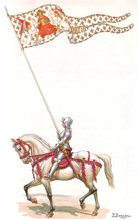 avec leur quatre bannières, que chacun portait en sa main. Tous quatre étaient armés de toutes pièces, à cheval, bien accompagnés, pour conduire