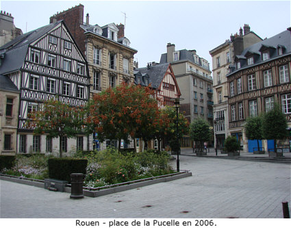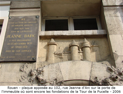La population de la ville a souvent montré qu'elle n'était pas complice des bourreaux de la Pucelle et Rouen s'honore depuis le XV° siècle de nombreux témoignages de reconnaissance, d'hommages du plus humble (enseignes de magasin...) au plus durable (monuments, noms de rue etc...). Deux croix furent élevées à la demande du tribunal de réhabilitation sur la place du Vieux-Marché (où elle existe encore) et à l'abbaye St-Ouen. Il faut d'ailleurs se souvenir que la ville de Rouen n'a été prise par les Anglais qu'après un siège interminable. Avant l'invasion anglaise elle était par son importance, la 3ème ville du royaume après Paris et Lyon. En 1455 à sa libération par Charles VII, une grande partie de la population a disparu dans les privations, la fuite et les tourments.