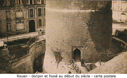 Philippe-Auguste a envahi la Normandie et a pris Rouen en juin 1204. Il fait édifié le château fort sur les hauteurs de la ville, sur les ruines d'un amphithéâtre antique romain. On sait peu de choses des bâtiments à l'intérieur du château, seulement qu'il y avait plusieurs chapelles (St-Louis, St-Romain...) et des logements d'habitation certainement adossés à la muraille (voir plan du chateau). Entre 1419 et 1449, les Anglais (le roi Henri, Bedford et sa femme entres autres) occuperont des logements richement meublés. Les fossés étaient aménagés de jardins. C'est dans ce château que Jeanne d'Arc est emprisonnée vers le 23 décembre 1430. La tour de la Pucelle, sa prison pendant le procès, est détruite en 1809 car devenue trop dangereuse pour le voisinage. Malheureusement les Français ne connaissaient pas encore suffisamment à Jeanne d'Arc pour sauver ce précieux bâtiment. Il est à noter que le démantèlement du château avait commencé en 1591. Au milieu du XVIIème siècle, il ne reste presque rien. Quelques vitraux (des chapelles ?) subsistent encore dans deux musées.