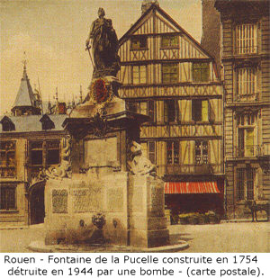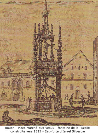 Parmi les monuments anciens que les Rouennais ont élevé, il faut retenir en tout premier la fontaine située place de la Pucelle où l'on a longtemps cru que la vierge avait été brûlée. La fontaine a été le premier hommage à la gloire de Jeanne d'Arc. Elle a été construite vers 1525 au centre de la place de la pucelle, anciennement appelée place du Marché-aux-veaux. Elle remplaçait l'ancienne fontaine qui a été dessinée en 1518 par Jacques Le Lieur dans son magnifique livre sur les fontaines de Rouen.