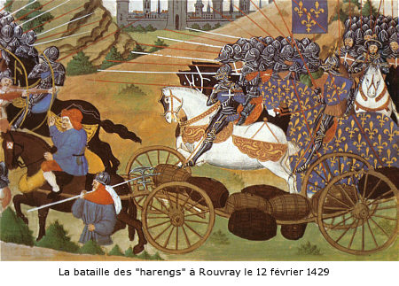 Vers le commencement de février 1429, Falstoff était revenu à Paris pour en ramener de nouveaux renforts, et, sous leur garde, tout un convoi de munitions et de vivres. Ce n'était pas moins de trois cents chariots avec un millier de gens du commun, marchands et autres, le prévôt de Paris, Simon Morhier, et quinze cents combattants anglais, normands ou picards. On entrait en carême : le convoi se composait surtout de barriques de harengs. L'occasion était excellente pour surprendre les Anglais dans l'embarras de ces voitures, et leur enlever leurs approvisionnements pour prix de la victoire ; mais les défenseurs d'Orléans n'eussent pas suffi à cette entreprise : la cour, à laquelle ils s'étaient adressés plusieurs fois, parut enfin consentir à tenter un effort. Le comte de Clermont, fils aîné du duc de Bourbon, amenait au secours du roi des hommes du Bourbonnais et de l'Auvergne. Avec lui se trouvait à Blois Jean Stuart, connétable d'Écosse, récemment revenu de Terre Sainte, et impatient de se retrouver en présence des Anglais. Ils se concertèrent avec plusieurs autres capitaines, et tandis que ceux-ci, passant par Orléans, allaient marcher au-devant du convoi pour lui barrer le chemin, eux, partant de Blois au nombre de trois ou quatre mille, se devaient rendre au point de la route, où l'on comptait bien le rejoindre : vainqueurs, ils se rabattaient sur la ville assiégée ; et, les habitants se joignant à eux, tout faisait croire que les bastilles anglaises, privées de leurs renforts et attaquées de deux côtés à la fois, n'auraient pas résisté (19)