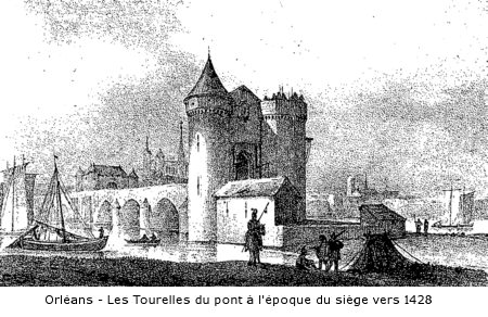 La prise d'Olivet, la reconnaissance poussée jusqu'aux Tourelles, avaient démasqué les vues de l'ennemi. Il voulait prendre le pont d'Orléans, non pour passer la Loire, mais pour bloquer la ville. C'est au delà de la Loire qu'il voulait s'établir pour la tenir en échec : tentative téméraire si Charles VII avait eu une armée capable de le combattre ; mais rien ne semblait à redouter du roi. Le 12 octobre 1428, Salisbury ayant passé la Loire vint donc se loger au Portereau, devant le pont. A son approche, les Orléanais en avaient détruit les maisons ; ils avaient en même temps mis le feu au couvent des Augustins, ne pouvant l'occuper et ne voulant pas laisser à l'ennemi une position si forte en face des Tourelles (4). Mais ils ne purent tellement le détruire, que l'ennemi ne trouvât moyen d'en relever les ruines; et en même temps que ses batteries, établies derrière la jetée de la Loire, lançaient des pierres de plus de cent livres sur la ville et détruisaient douze moulins qu'elle avait sur le fleuve, Salisbury, de cette bastille improvisée, attaquait le boulevard des Tourelles par la mine comme par le canon (5).