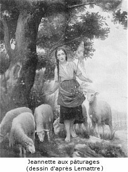 Aux premières marques de cette vocation divine, Jeanne se donna tout entière à Dieu en lui vouant sa virginité. Elle vivait dans le commerce de ses saintes, ne changeait rien d'ailleurs à sa manière de se conduire. On la voyait bien quelquefois quitter ses compagnes, se recueillir comme si elle était devant Dieu, et les autres s'en moquaient. Mais nul ne sut ce qui se passait en elle, pas même celui qui l'entendait en confession. Elle garda la chose secrète, non qu'elle se crût obligée à la taire, mais pour mieux assurer du succès quand le temps viendrait de l'accomplir : car elle craignait les pièges des Bourguignons, elle craignait les résistances de son père (3).